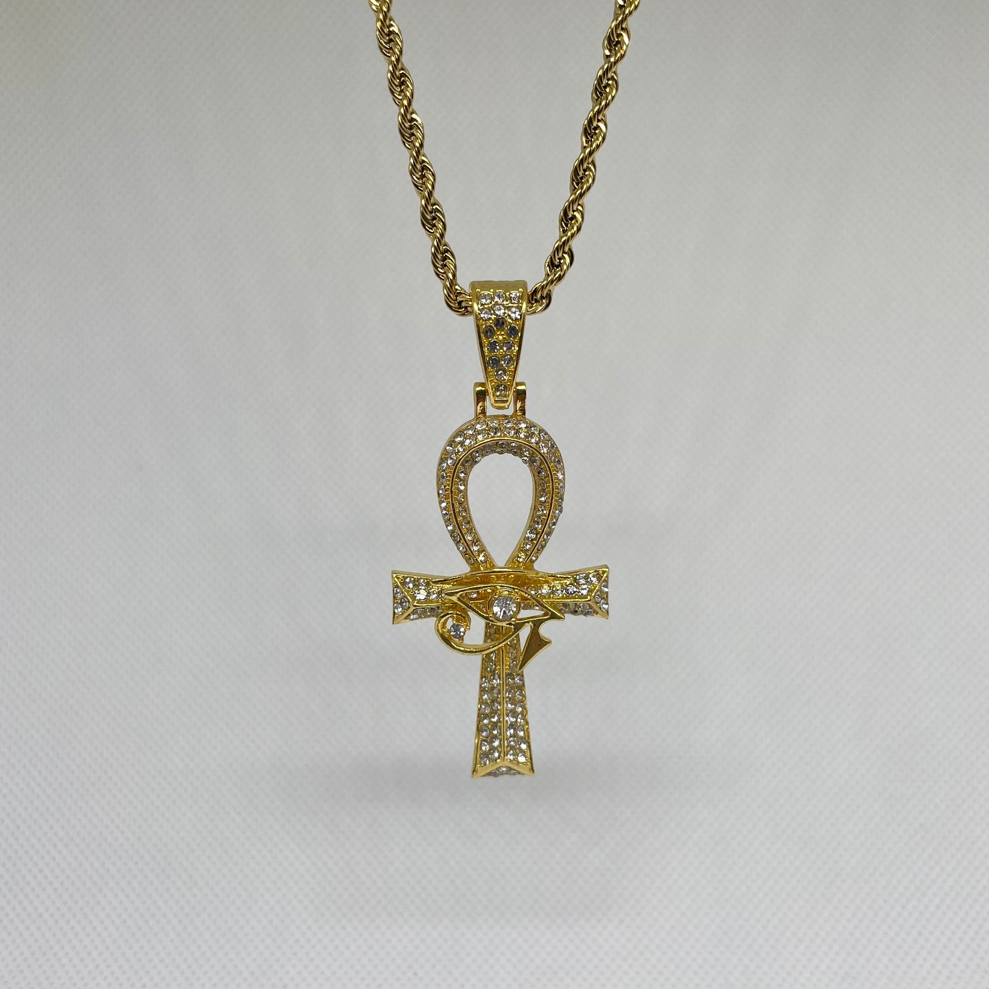 A stunning blend of ancient symbolism and modern elegance, the Eternal Radiance Ankh necklace features the timeless ankh symbol intertwined with the protective Eye of Ra. Crafted in a striking mix of silver and gold tones, this piece is adorned with shimmering rhinestones that catch the light from every angle. A perfect talisman of life, protection, and divine energy—wear it to channel strength and radiate timeless beauty.