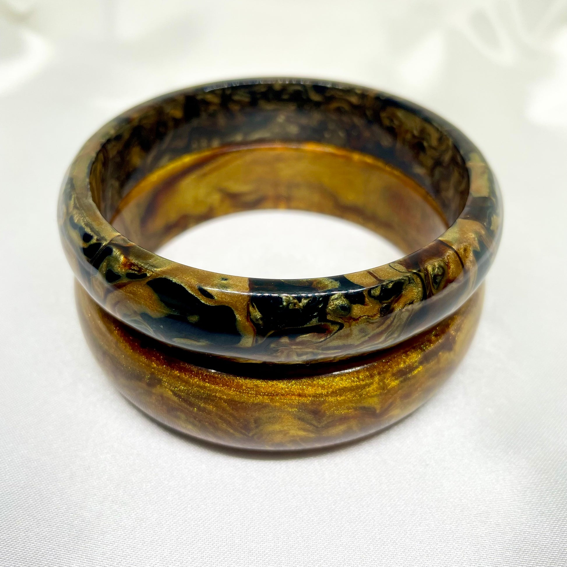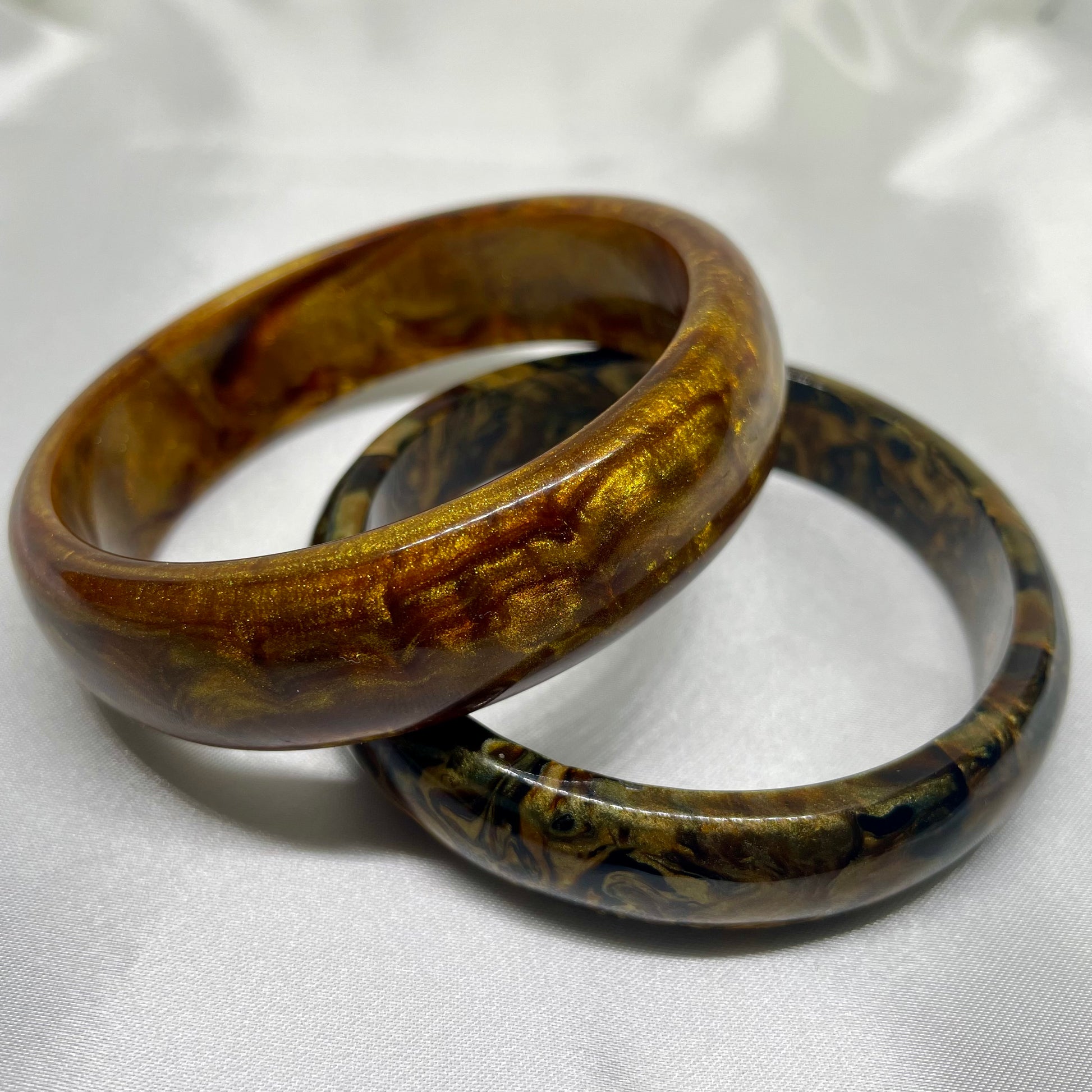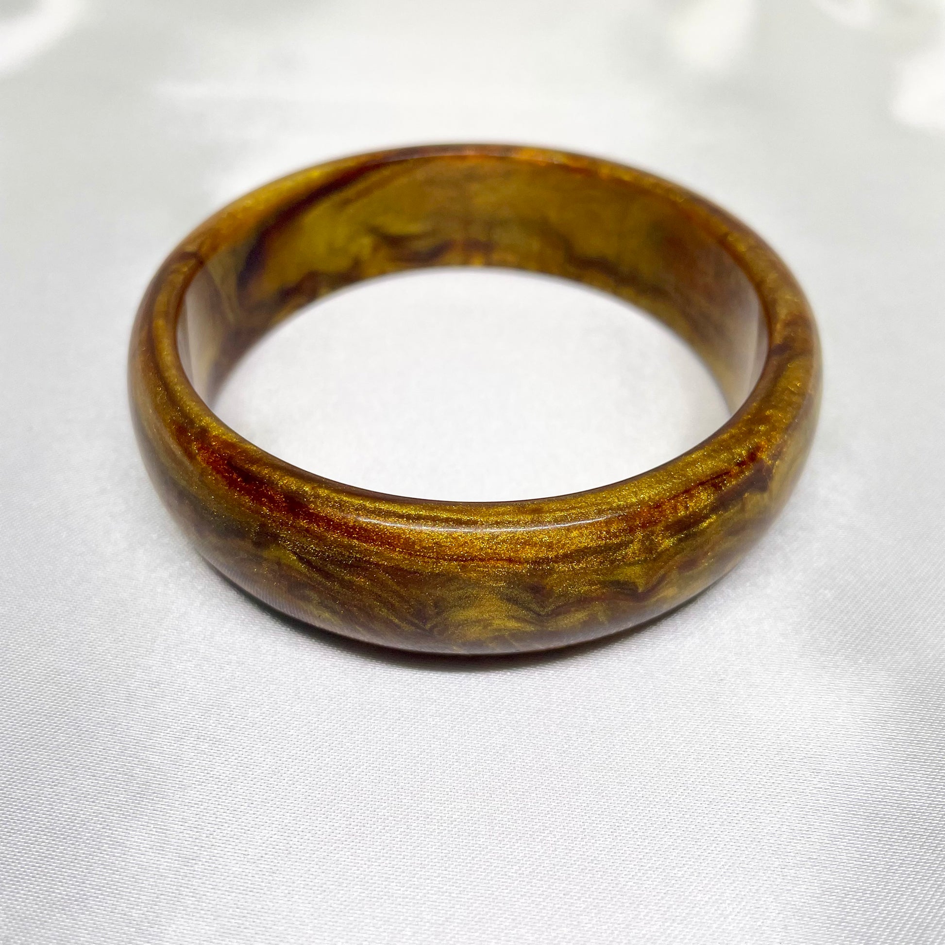A luminous dance of golden hues and warm amber swirls, Golden Mirage captures the fleeting beauty of sunlight on desert sands. Its polished finish reflects a soft radiance, reminiscent of a mirage shimmering under a golden sky. Elegant, warm, and timeless, this bangle embodies grace and sophistication with a touch of enchantment.