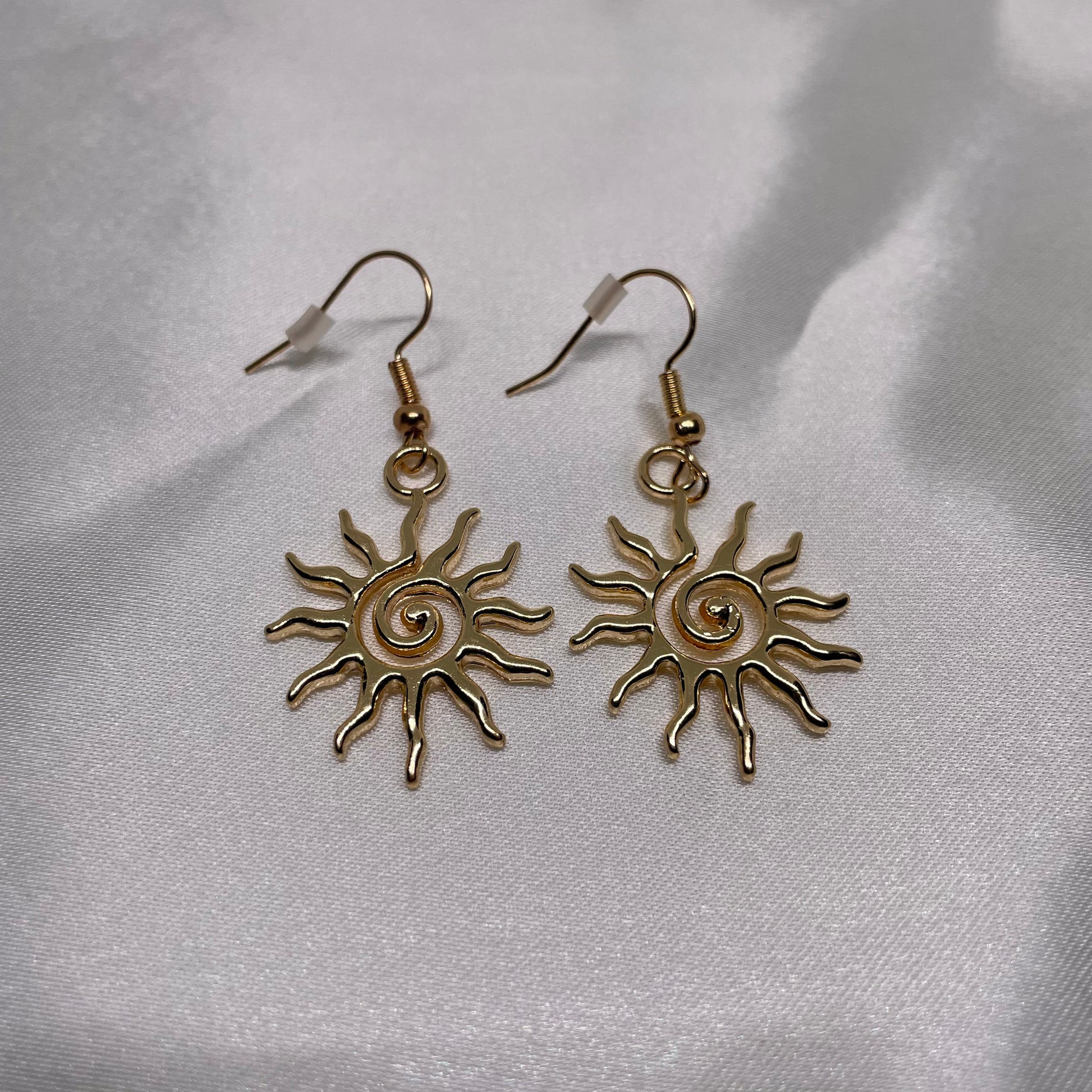 Brighten up your look with the Solaris Earrings. These stunning gold-tone earrings feature a spiral sun design, adding a touch of warmth and elegance to any outfit. Perfect for both everyday wear and special occasions.
