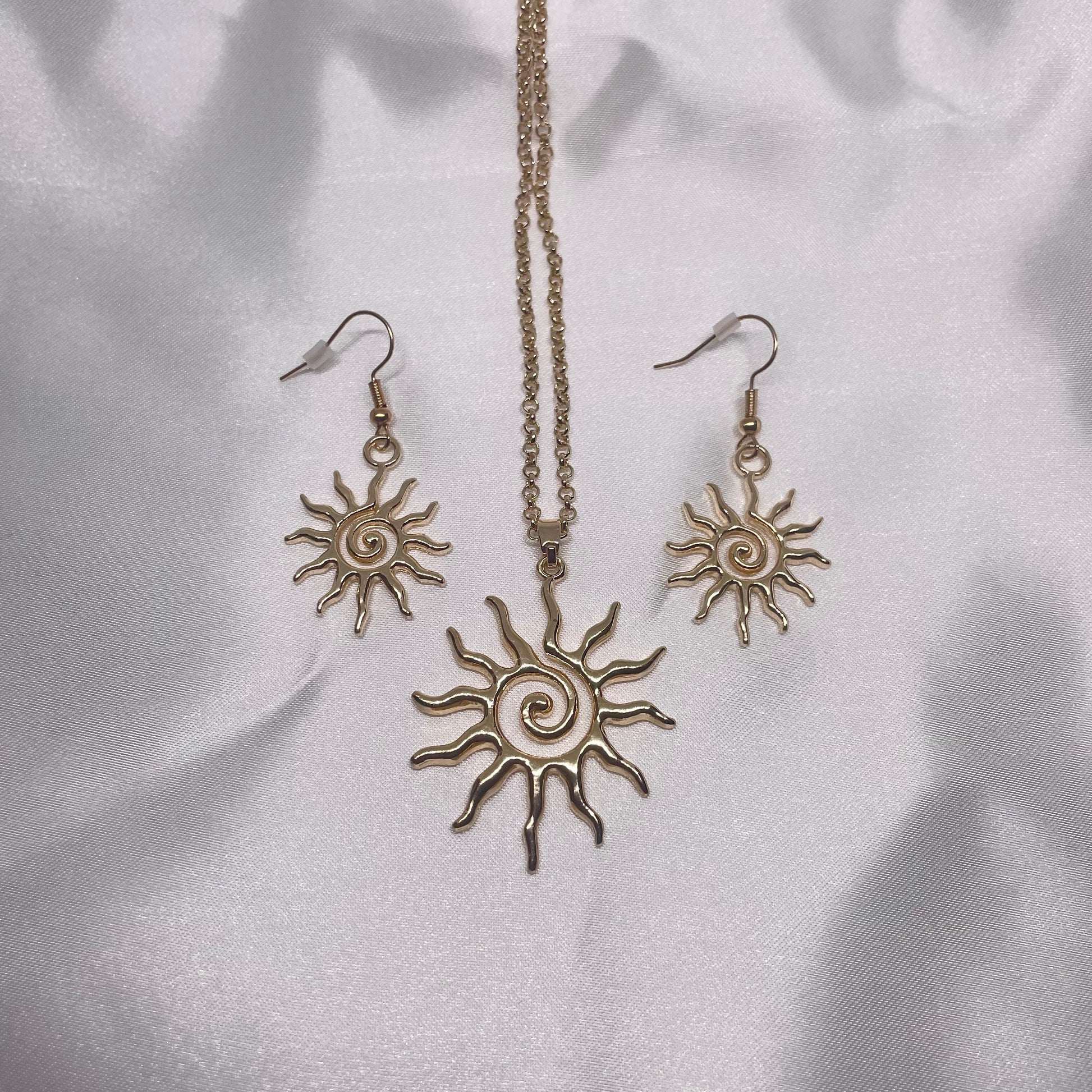 Shine bright with the Solaris Set - This golden necklace and earring pair captures celestial energy and boho elegance, perfect for elevating your everyday look or adding a radiant touch to any festival outfit. Lightweight and eye-catching, it’s made for those who love to stand out and shine from within.